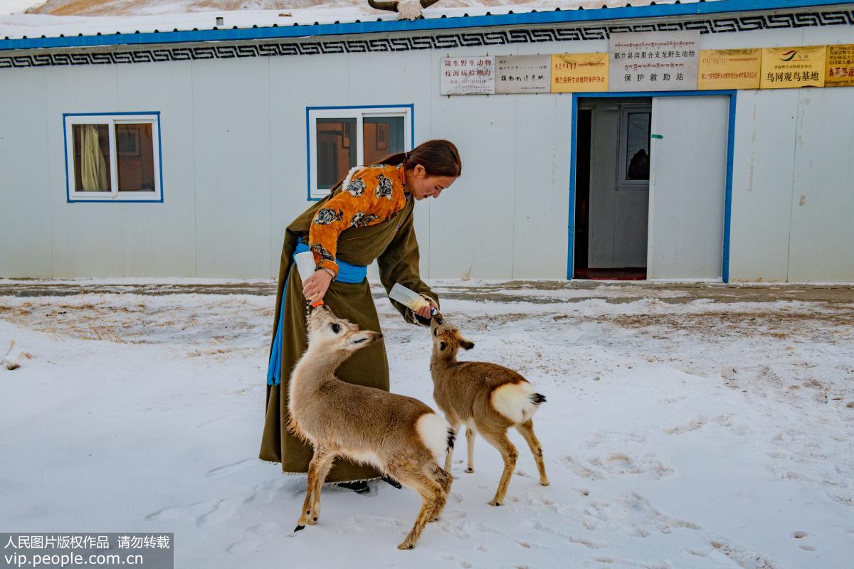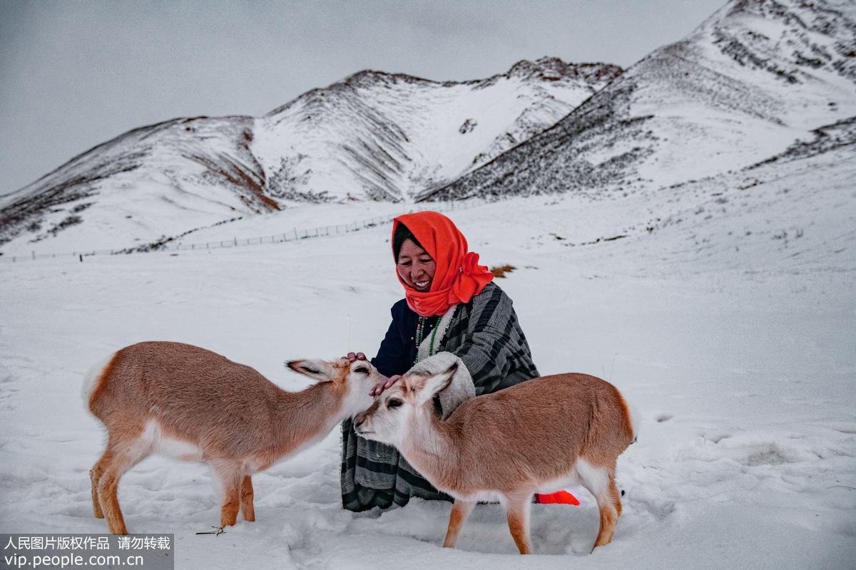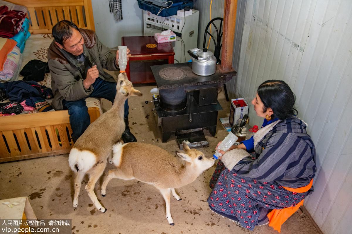 Robow and his wife feed rescued Tibetan gazelles. (vip.people.com.cn/Song Linji)