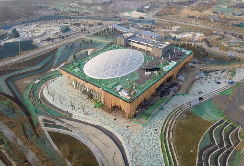 An Aerial photo taken by a drone on January 19, 2019 shows the Plant Pavilion in 2019 International Horticultural Exhibition site in Yanqing District, Beijing. [Photo: Xinhua]