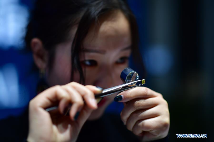 A worker checks a man-made diamond at Zhengzhou Sino-Crystal Diamond Co., Ltd. in Zhengzhou, central China's Henan Province, Jan. 30, 2019. (Xinhua/Feng Dapeng)