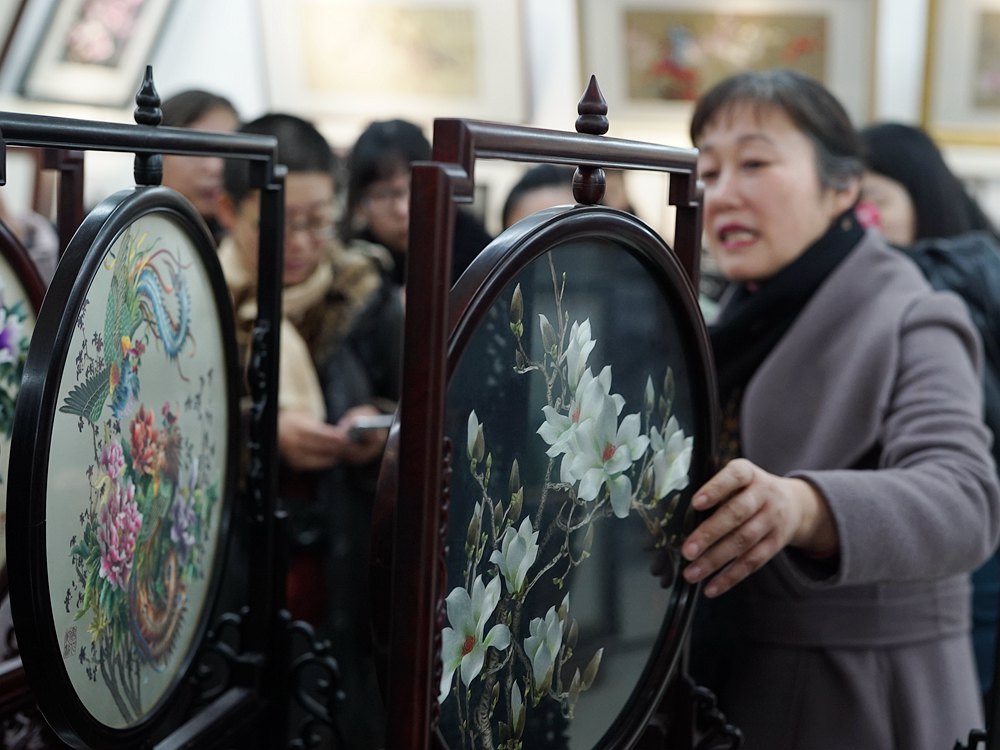 Yao Huifen introduces her works to visitors. (Photo/People's Daily Online)