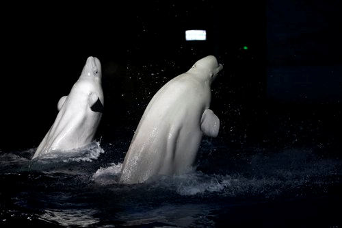 Two beluga whales perform for Shanghai audiences for the last time.