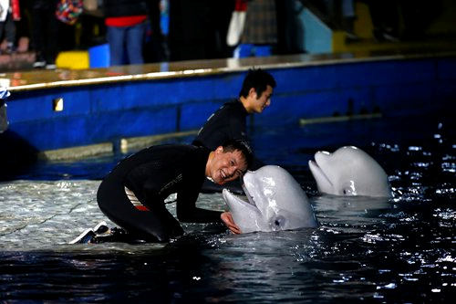 Tamers bid farewell to two beluga whales at their last show in Shanghai Chang Feng Ocean World on Thursday. They will be sent to a reserve in Iceland in April. Photo: Yang Hui/ Global Times