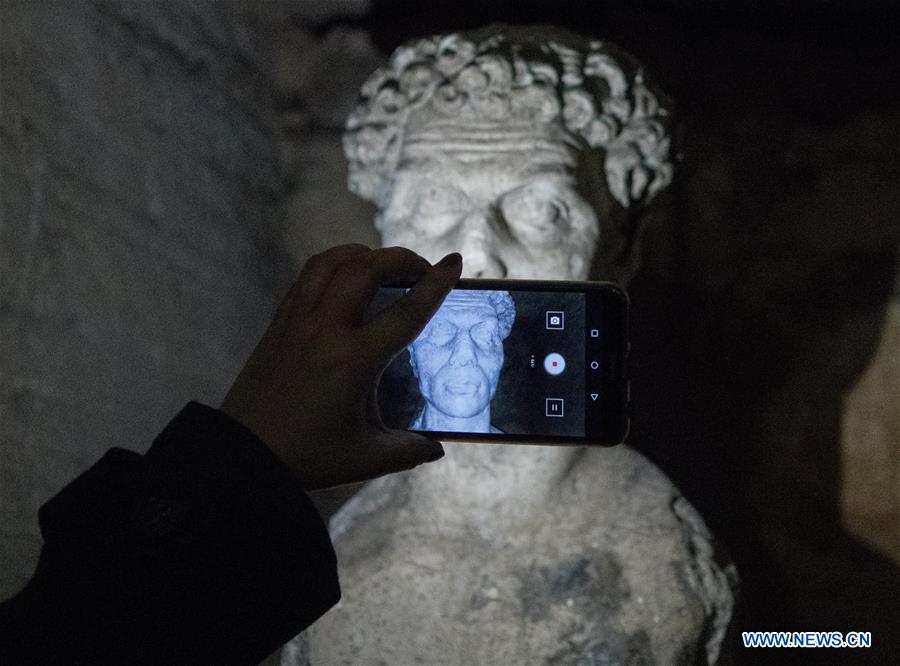A man takes photos in ancient Kom al-Shoqafa tombs in the northern seaside Alexandria province, Egypt, on March 3, 2019. The Egyptian Ministry of Antiquities celebrated on Sunday the completion of a project removing underground water from 2,000-year-old catacombs in the northern seaside province of Alexandria dating back to the Greco-Roman era. (Xinhua/Wu Huiwo)
