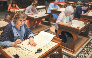 Tourists practice Chinese calligraphy in Boao as part of a medical tourism package. [Photo provided to China Daily]