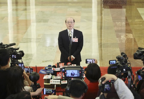 Liu Jieyi, head of the Taiwan Work Office of the Communist Party of China Central Committee and the State Council Taiwan Affairs Office, is interviewed at the Great Hall of the People in Beijing, March 5, 2019. [Photo/Xinhua]