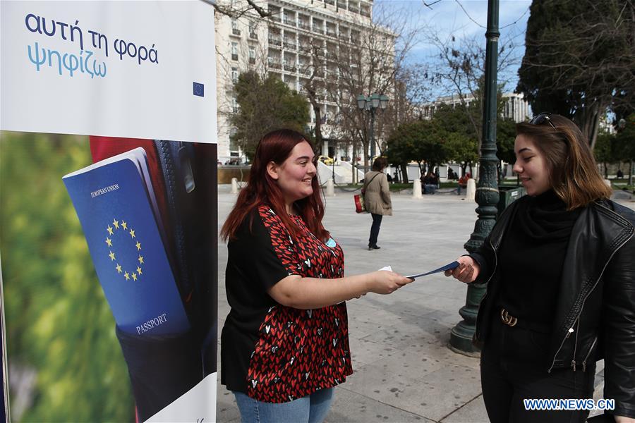 A Greek volunteer hands out leaflets which contain voting information about the forthcoming European Parliament elections at Syntagma square, in Athens, Greece, on March 5, 2019. The European Parliament elections are expected to be held between May 23 and May 26, 2019. (Xinhua/Marios Lolos)