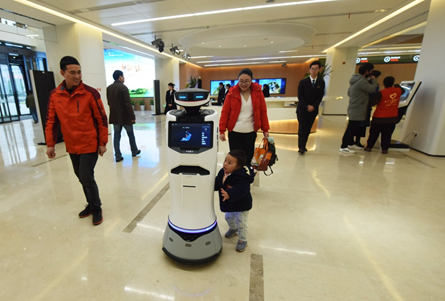 Residents are guided by AI robot Xiaotu in the New Service Center in Hangzhou Xiaoshan District on January 2. (Long Wei from People’s Daily Online)