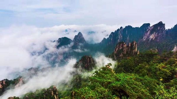 At 10 am in Anhui, the infinite haze of clouds turns Mount Huangshan into a fairyland.