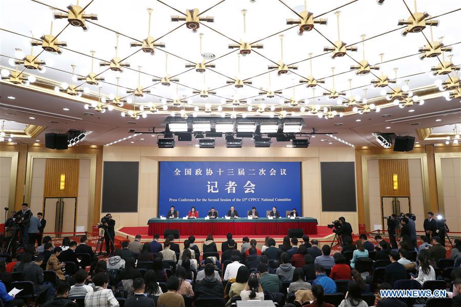 Liu Shijin, Nan Cunhui, Ye Qing, Zhou Hongyi and Zhou Qunfei, members of the 13th National Committee of the Chinese People's Political Consultative Conference (CPPCC), attend a press conference on optimizing the business environment and facilitating the high-quality development of the private sector for the second session of the 13th CPPCC National Committee in Beijing, capital of China, March 6, 2019. (Xinhua/Shen Bohan)