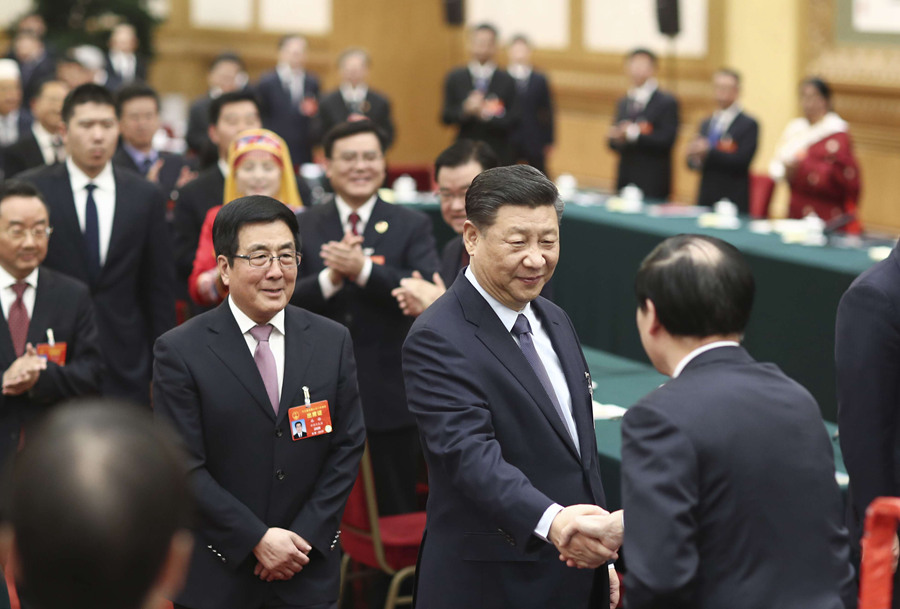 President Xi Jinping, also general secretary of the Communist Party of China Central Committee and chairman of the Central Military Commission, shakes hands with a lawmaker from Gansu province on March 7, 2019. [Photo/Xinhua]