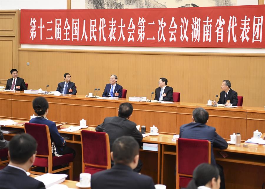 Chinese Vice President Wang Qishan joins deliberation with deputies from Hunan Province at the second session of the 13th National People's Congress in Beijing, capital of China, March 7, 2019. (Xinhua/Yan Yan)