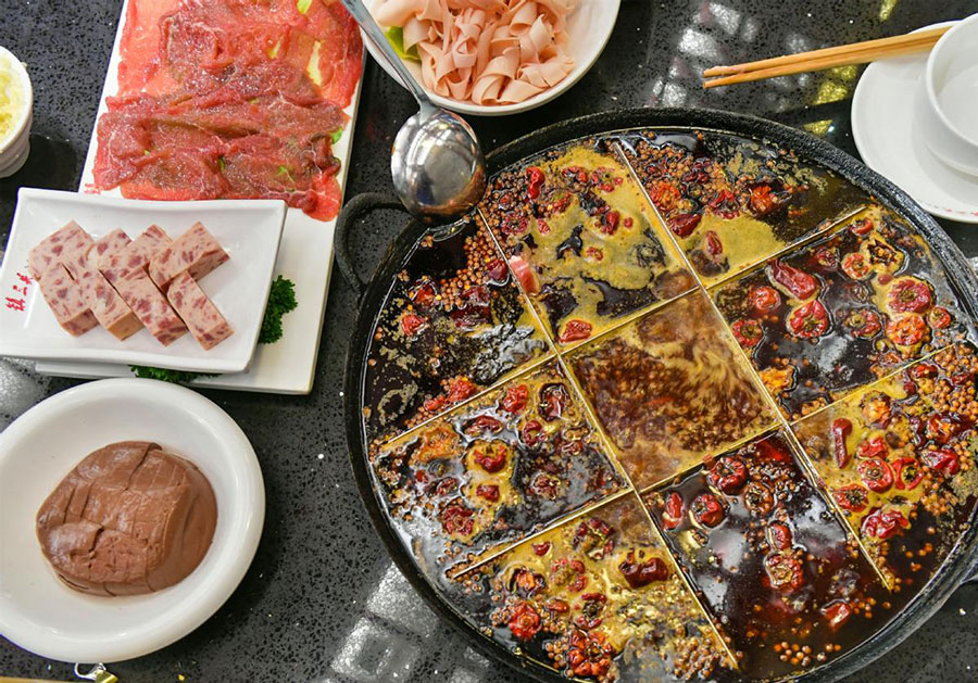 The traditional spicy chili oil hotpot is divided into nine sections because in the past, several people shared one pot and put food in their own sections.