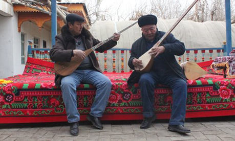 Aiyiti (right) plays one of his musical instruments with his apprentice in Aiyiti's house.( Photo from Global Times)