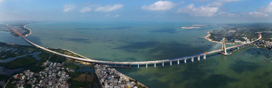 Crossing over the Puqian Bay in the northeastern part of China’s Hainan province, Puqian Bridge is built over seismic faults, with the highest level of seismic resistance fortification and the highest level of designed wind speed in China. It is the first large-span bridge of China that crosses over a geological fault line.
