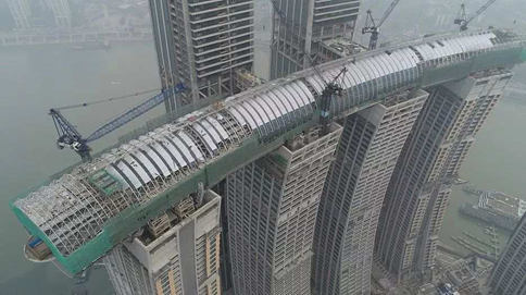 The world’s first “horizontal skyscraper” is about to be completed in China’s Chongqing municipality, as a huge rooftop corridor is being constructed on a group of skyscrapers. Stretching over 300 meters, the enormous glass-walled structure connects four buildings of the eight-unit skyscraper cluster at the 60th floor, turning the architectural complex into a three-dimensional “sail”.