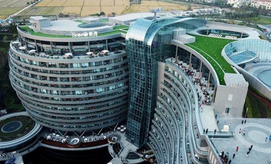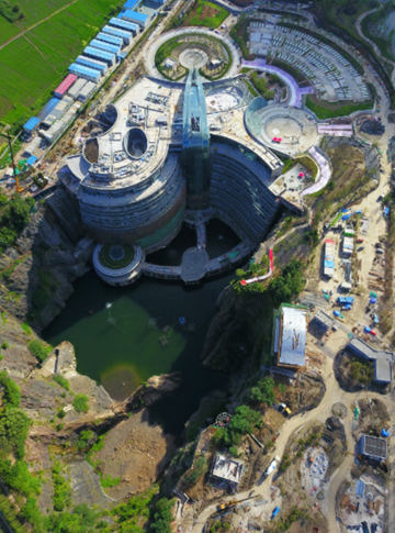 The aerial photo taken on July 12, 2018 shows the InterContinental Shanghai Wonderland, also known as the Deep Pit Hotel on Chenhua Road, Songjiang district, Shanghai. (Photo: Han Xin from People’s Daily Online)