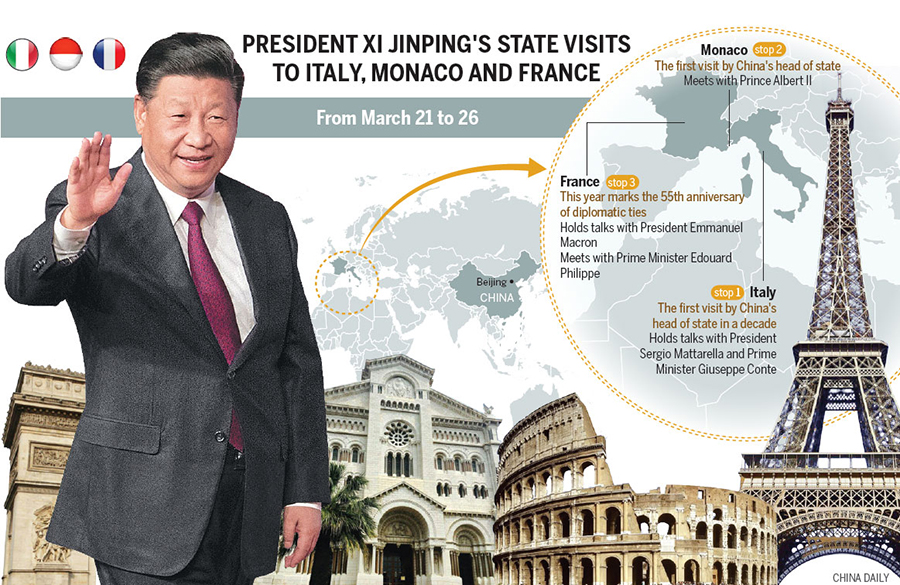 During his state visit to Italy, the first stop of a six-day tour that will take him to three nations, Xi and Italian Prime Minister Giuseppe Conte will jointly witness the signing of intergovernmental cooperation documents in fields of diplomacy, economy and trade, and culture, as well as commercial agreements in infrastructure, machinery and finance.