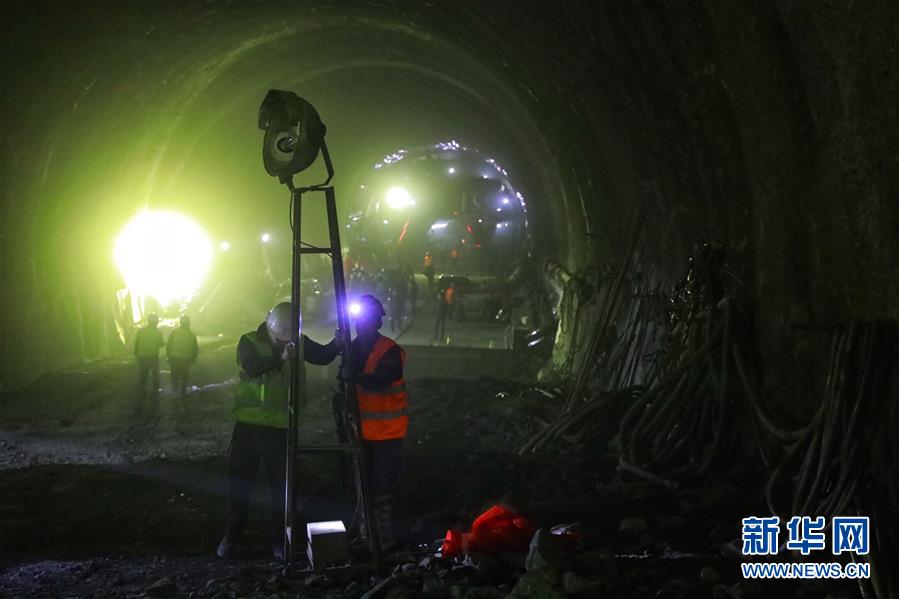 Workers construct the Daliangshan tunnel, March 21. (Photo/Xinhua)