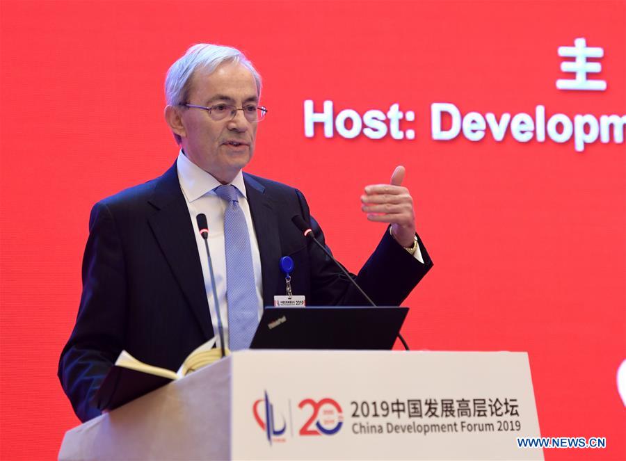 Christoforos Pissarides, professor of the London School of Economics and Political Science and Nobel Prize winner, speaks at the Economic Summit of China Development Forum 2019 in Beijing, capital of China, March 23, 2019. The three-day China Development Forum, which kicked off Saturday, will focus on key issues such as the supply-side structural reform, new measures of proactive fiscal policy, and the opening-up of the financial sector and financial stability. More than 50 officials from the Chinese central government's departments and over 150 overseas delegates will participate in the forum, including 96 executives from the world's leading companies and nearly 30 globally well-known scholars. (Xinhua/Li He)