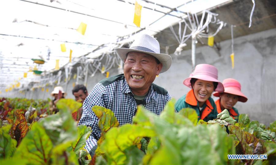 An agricultural technician instructs farmers in planting at a greenhouse in Xigaze, southwest China's Tibet Autonomous Region, Aug. 28, 2016. Tibet's 2018 GDP reached 147.76 billion yuan (22 billion U.S. dollars), about 191 times more than the 1959 figure calculated at comparable prices, said a white paper released Wednesday by China's State Council Information Office. Through 60 years of hard work, the people in Tibet have seen agriculture and animal husbandry become increasingly modernized, said the white paper, titled "Democratic Reform in Tibet -- Sixty Years On." (Xinhua/Jigme Dorje)