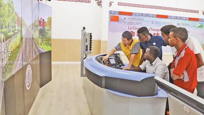 Local students are taught to drive train on a simulation machine. (Photo by Lyu Qiang from People’s Daily)
