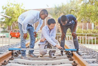 A Chinese teacher trains local students in railway gauge measurement. (Photo by Lyu Qiang from People’s Daily)