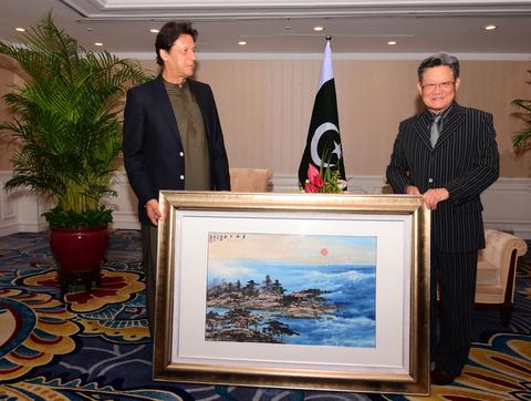 Sha Zukang presents Pakistani Prime Minister Imran Khan with a Chinese painting created by artist Zhou Zhihui. (Photo: Long Ren)
