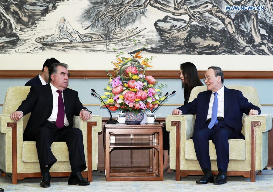 Chinese Vice President Wang Qishan (R, front) meets with Tajik President Emomali Rahmon at the Diaoyutai State Guesthouse in Beijing, capital of China, April 28, 2019. (Xinhua/Ding Lin)