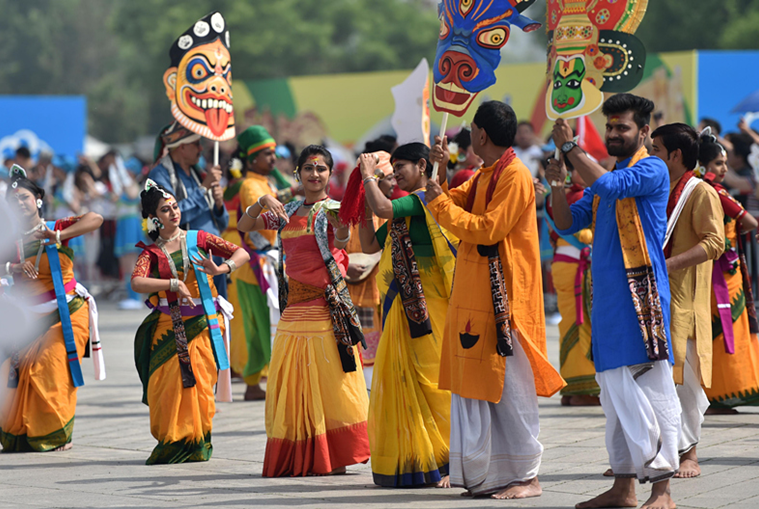 Actors and actresses perform during the Asian Civilization Parade, May 16, 2019. Costumed performers from 16 countries and 28 domestic performance teams presented festive songs and dances to showcase the distinctive charm of Asian civilizations. (Photo by Weng Qiyu/People’s Daily Online)