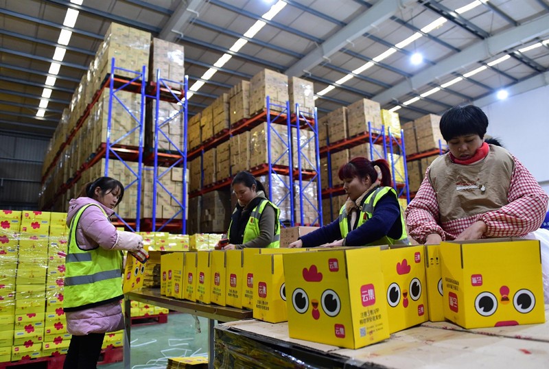 On the afternoon of February 25, 2019,in the Haicang supply chain platform of Yiwu Bonded Logistics Center, the staff is packing Korean cosmetics that have been ordered for sale in China.