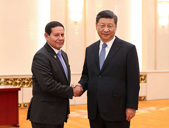 Xi asked Mourao to extend his sincere greetings to Brazil's President Jair Bolsonaro, who took office in January. China appreciates the efforts made by the new government to promote the comprehensive strategic partnership, he said.
