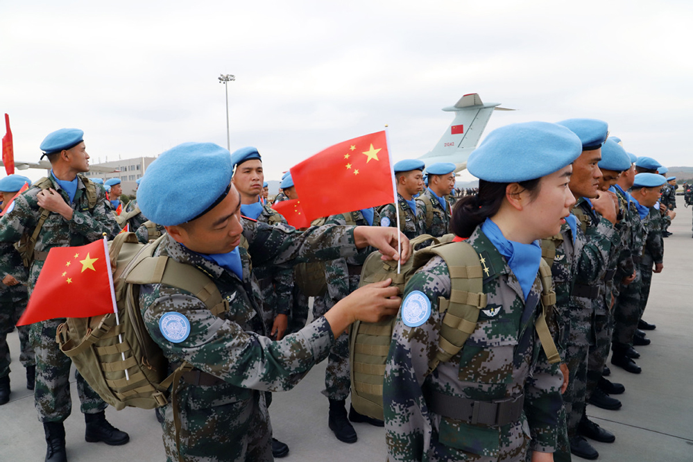 A peacekeep adjusts the Chinese flag attached to another peacekeeper's military backpack as they get ready to board the plane, May 22, 2019. [Photo by Sun Shuai for chinadaily.com.cn]