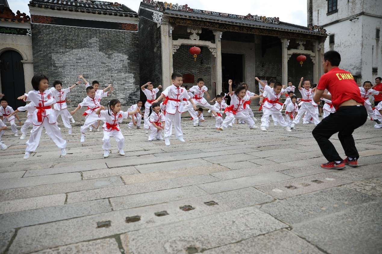 Children do warm-up exercise with Lu Qinghua, a national martial arts champion winner, in Huitong village, Zhuhai city, Guangdong Province, June 1, 2019. (People’s Daily Online/Du Mingming)