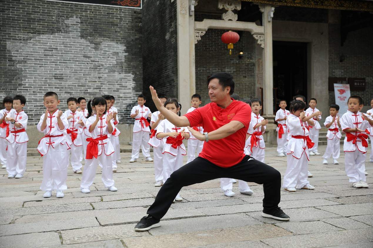 Chen Lun, a world champion winner of Chinese martial arts Nanquan, coaches children in Huitong village, Zhuhai city, Guangdong Province, June 1, 2019. (People’s Daily Online/Du Mingming)