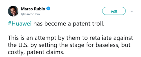 “Huawei has become a patent troll,” Rubio tweeted last week in response to a Wall Street Journal report that said Huawei wants Verizon to pay licensing fees for its patents. “This is an attempt by them to retaliate against the US by setting the stage for baseless, but costly, patent claims.”