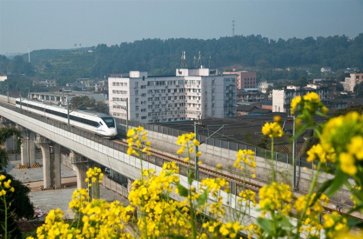 On March 10, 2019, on the outskirts of Pujiang County, Sichuan, the China Railway High-speed (CRH) drove past the village full of flowers. Chengya Railway, a section of the Sichuan-Tibet Railway, has been running through the whole line. (Photo by Zhu Chunjian from People’s Daily Online)