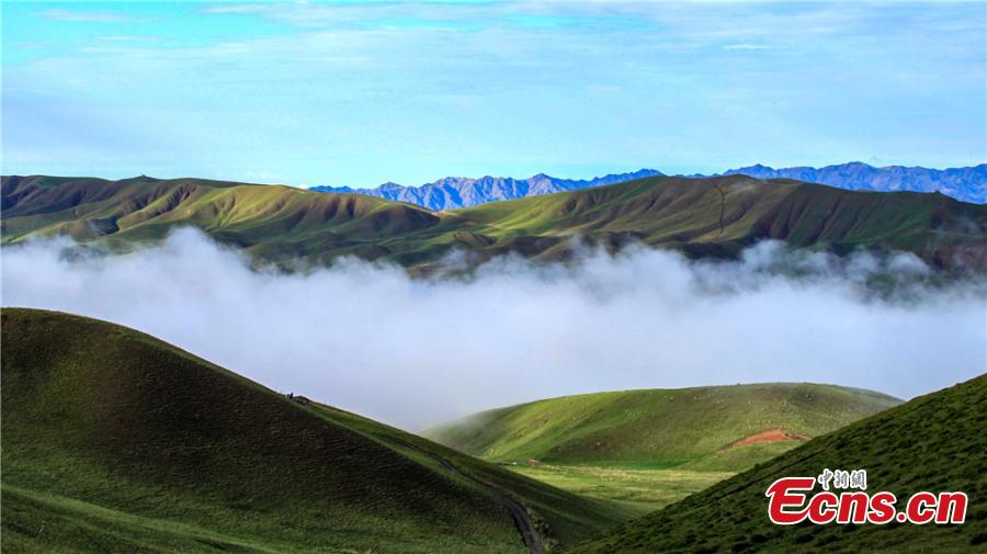 Grassland at the foot of the Qilian mountains lay shrouded in mist in Sunan Yugur Autonomous County, Northwest China’s Gansu Province. (Photo: China News Service/Yang Shijun)