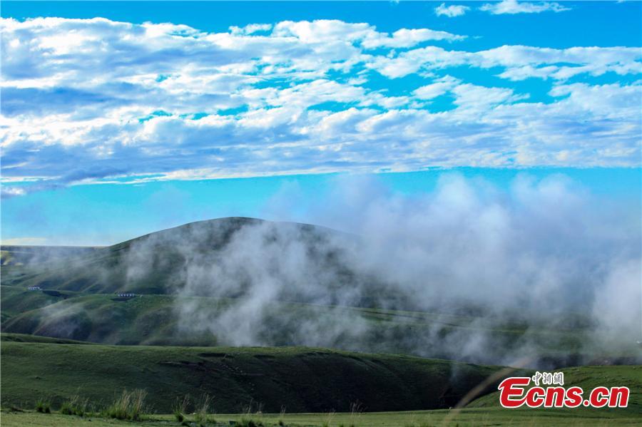Grassland at the foot of the Qilian mountains lay shrouded in mist in Sunan Yugur Autonomous County, Northwest China’s Gansu Province. (Photo: China News Service/Yang Shijun)