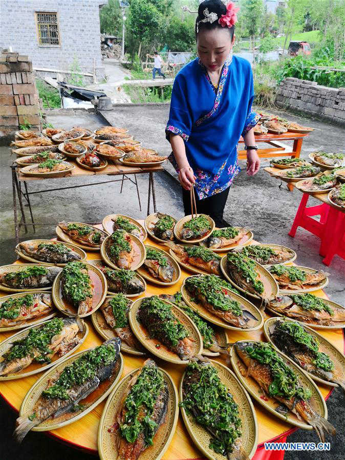A woman of Miao ethnic group prepares food during a dragon canoe festival in Shidong Town, Taijiang County, southwest China's Guizhou Province, June 27, 2019. Local Miao people celebrated the annual festival in the town Thursday. (Xinhua/Yang Wenbin)
