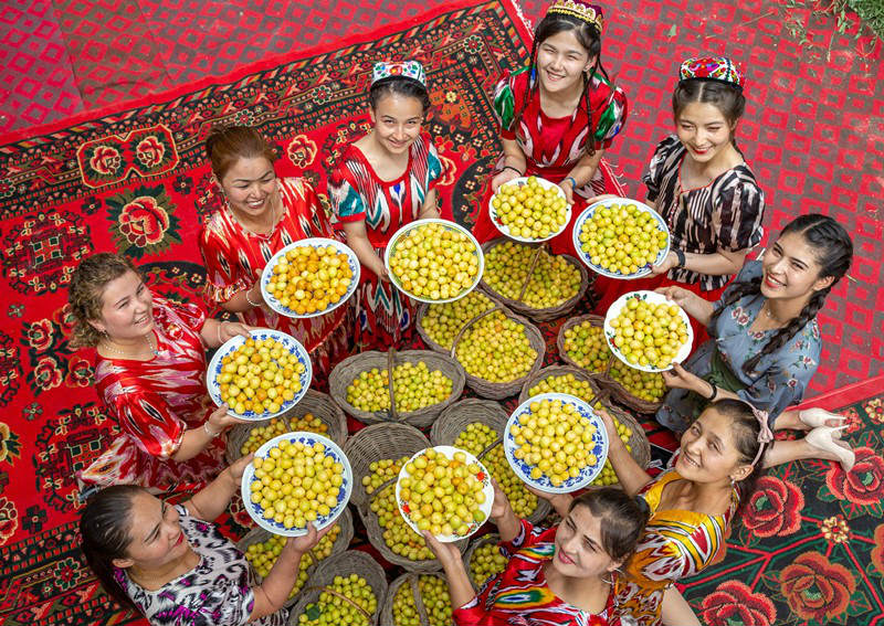 Women harvest almonds in Kuqa county, northwest China’s Xinjiang Uyghur Autonomous Region, June 16, 2019. The county has developed an almond industry chain that has become a major source of income for local farmers. (Photo: Yuan Huanhuan/People’s Daily)