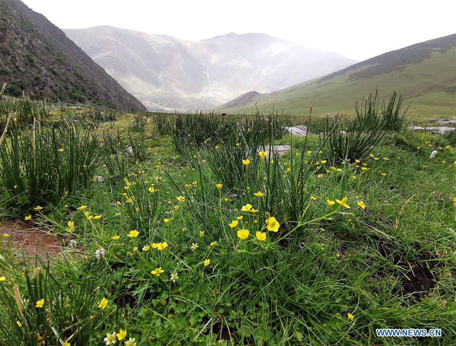 Flowers bloom on a pasture at Damxung County of Lhasa, southwest China's Tibet Autonomous Region, July 13, 2019. (Xinhua/Purbu Zhaxi)