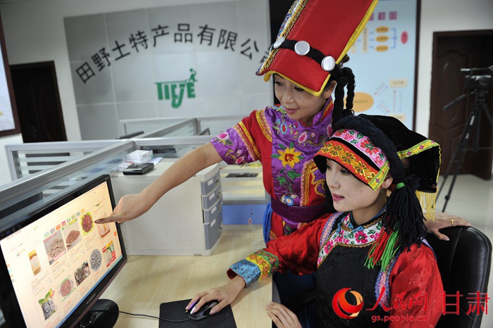 Workers sell local farm produces through online store in Longnan, Gansu province. (Photo/People's Daily Online)