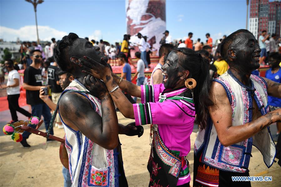 People of the Yi ethnic group daub each other's face during Hualian ("daubed face") Festival in Qiubei County, southwest China's Yunnan Province, July 18, 2019. The Hualian Festival is a traditional annual festival of the Yi ethnic group in Qiubei County where people drive out evil and get good luck by daubing their faces black. (Xinhua/He Chunhao)