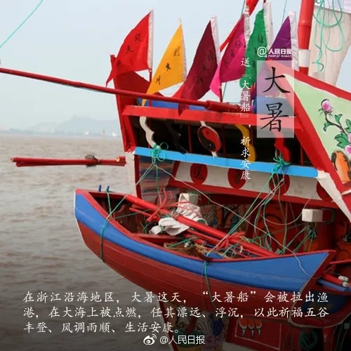 In the coastal Areas in Zhejiang Province, there is a tradition of sending away the "Major Heat ship”. On that day, a group of fishermen take turns to carry the ship while marching through the streets. Drums are played and fireworks are lit. On the street sides, people pray for blessings. After that, the ship is carried to the wharf, pulled out of the port and finally burned at sea. This ritual is to pray for harvests, good weather, happiness and health.