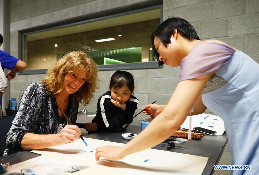 Participants try Chinese calligraphy during the "EU-China Youth Music & Art Festival 2019" held in Zandhoven, a small town in north Belgium, July 27, 2019. The "EU-China Youth Music & Art Festival 2019" opened on Saturday night in Zandhoven. Young people and folk artists from Belgium and China gathered for musical performances. (Xinhua/Pan Geping)