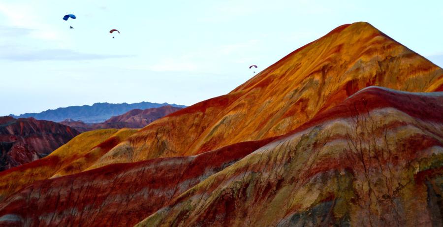 Parasailors glide over a symphony of hues at Zhangye Danxia Landform Geological Park, famous for its rainbow-colored rock formations, in Zhangye city in Northwest China's Gansu Province. (Photo provided to chinadaily.com.cn)