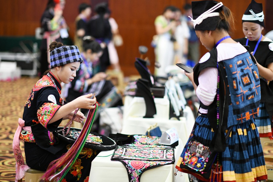 Craftswomen embroid at the competition in Guiyang, Southwest China's Guizhou province, on Aug 14. (Photo/Xinhua)
