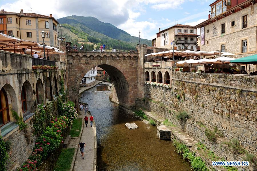 Tourists visit the village of Potes at the foot of Picos de Europa, Spain, Aug. 20, 2019. (Xinhua/Guo Qiuda)