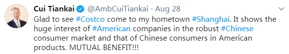 Cui Tiankai, Chinese Ambassador to the US, responded to the news, calling it a mutual benefit for both countries. On his Twitter account, Cui wrote that the opening of the store in Shanghai shows the huge interest of American companies in the robust Chinese consumer market and that of Chinese consumers in American products.