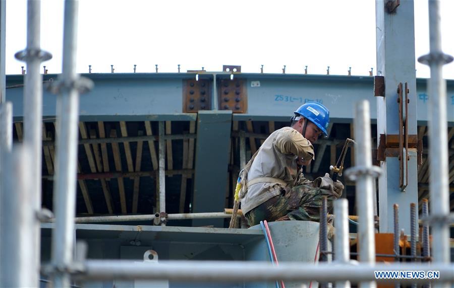 A laborer works at the construction site of tourist service facilities in the Jiuzhaigou National Park in southwest China's Sichuan Province, Sept. 25, 2019. Tourist service facilities in Jiuzhaigou National Park are under construction. Covering a total area of 30649.84 square meters, the facilities include a tourist center, emergency shelter, and state-level observatory, etc. (Photo by Wang Xi/Xinhua)